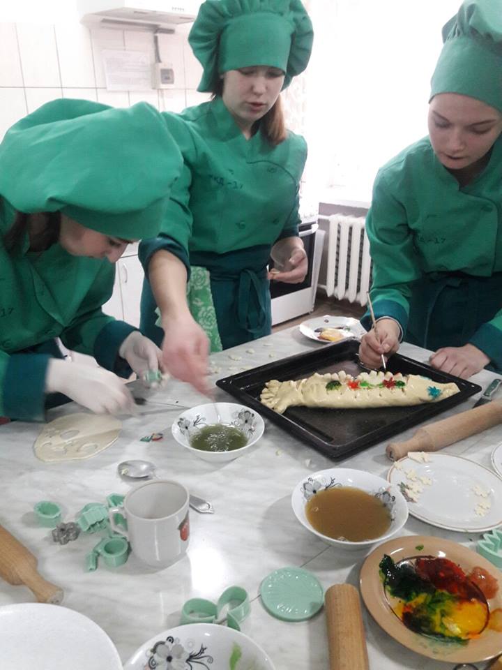 У цьому переконали нас учні групи ККД-17 під керівництвом майстра Мирончук М.В. Під час вивчення теми “Приготування мучних виробів” майстер запропонувала учням виготувати традиційний закритий пиріг з начинкою ( кулебяку) у сучасному оформленні. Марина Василівна вчила майбутніх кондитерів працювати з харчовими барвниками, розведеними з яєчним жовтком і не обмежувала політ фантазії своїх учнів. В результаті вироби не лише мали різноманітні форми, а й були прикрашені квітами, колосками, листочками.