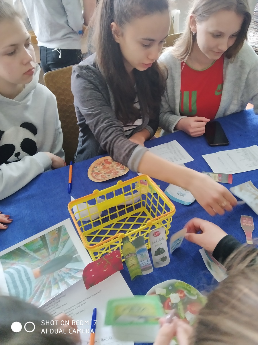 Третина наших учнів живуть у гуртожитку, для них провели гру «Collect a grocery basket». Дівчата – кухарі збирали продуктові кошики та розраховували кількість продуктів для приготування традиційних салатів та піцци за англійськими рецептами.