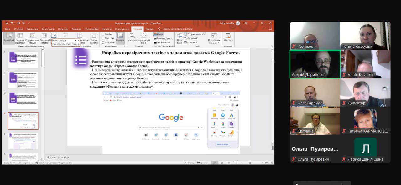 Методист училища ознайомила з дидактичними та методичними принципами розробки електронного освітнього контенту, вимогами до структури і змісту онлайн-уроків. Надала джерела пошуку матеріалів для створення якісних освітніх матеріалів.
