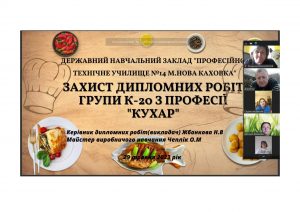 Логічним завершенням Всеукраїнського тижня професійної освіти став захист дипломних робіт без п’яти хвилин кухарями 4 розряду з групи К-20. Випускники добре підготувались до свого останнього іспиту та продемонстрували хороші фахові знання. За ці 3 роки навчання хлопці та дівчата змужніли, подорослішали, навчились приймати власні рішення та відповідати за них.На фінішній прямій
