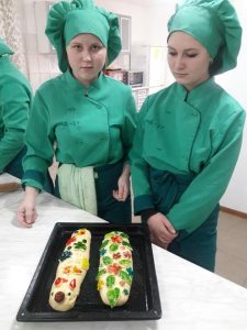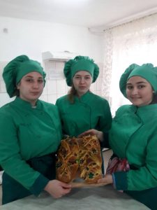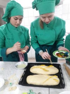 У цьому переконали нас учні групи ККД-17 під керівництвом майстра Мирончук М.В. Під час вивчення теми “Приготування мучних виробів” майстер запропонувала учням виготувати традиційний закритий пиріг з начинкою ( кулебяку) у сучасному оформленні. Марина Василівна вчила майбутніх кондитерів працювати з харчовими барвниками, розведеними з яєчним жовтком і не обмежувала політ фантазії своїх учнів. В результаті вироби не лише мали різноманітні форми, а й були прикрашені квітами, колосками, листочками.